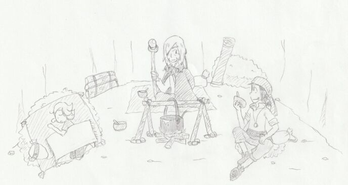 その夜のこと――。オルクの暮らす洞窟内では焚き火がパチパチと燃え、その上にスープの入った鍋が乗っている。サルマがそこから木のお椀にスープをすくう。
