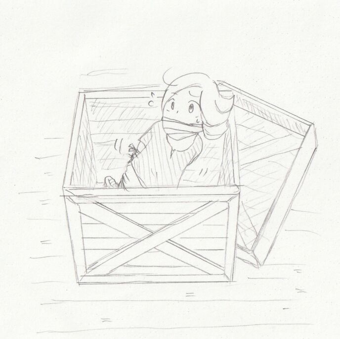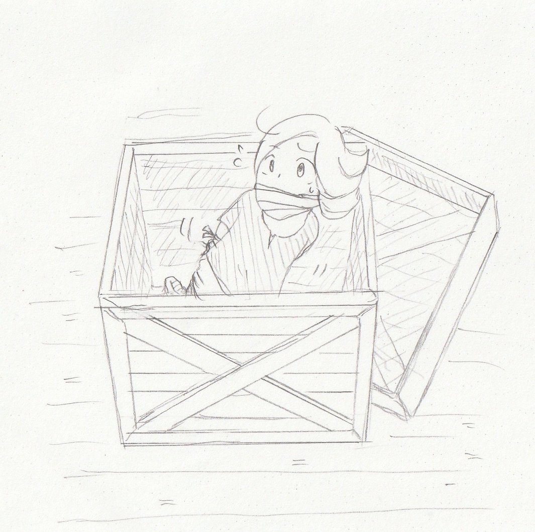 戦士に促されて木箱の中を覗くと、黄金色のやや癖っ毛の女の子……アイラが、口にさるぐつわをされ、両手両足を布で縛られている状態で発見される。