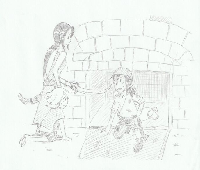 リーシはオーブンの前まで歩いてゆき、鉄でできている黒い蓋の、持ち手の部分に手をかけて引っ張って開けようとするが、なぜか開かない。リーシは眉をひそめ、腰に下げている三日月剣の鞘から剣をゆっくりと抜き、オーブンの方に突きつける。