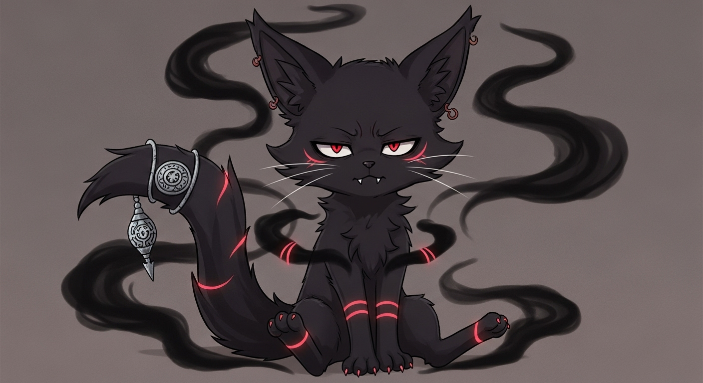 彼女の足元には、猫のような姿をした使い魔、カラクサが静かに寄り添っている。