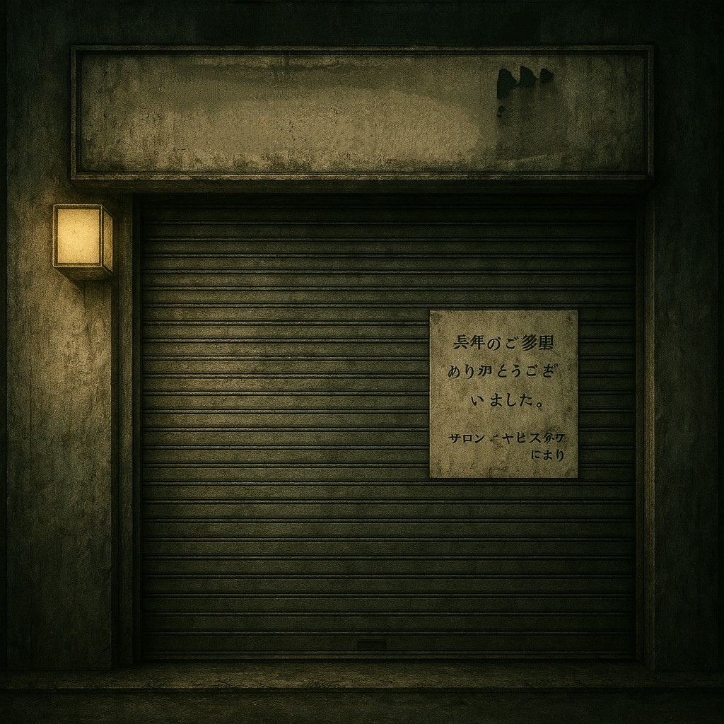 そこには道路など無く、一昨日、8月4日に閉店した美容室があった。店の看板は消され、閉じたシャッターには「長年のご愛顧ありがとうございました。サロン・ミヤビスタッフより」と貼り紙があるだけだった。