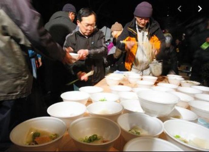 その上に鳥の唐揚げやあらかじめ用意した天ぷら、炒め物をのせて、順番を待ってる人達に次々と手際よく盛りつけていた。ボーットしていると手伝ってくださいと盛りつけた丼を配る手伝いをさせられた。1つの大釜がなくなると水で洗って次に御飯をといで炊飯の準備を整えて切らさないようにしていた。
