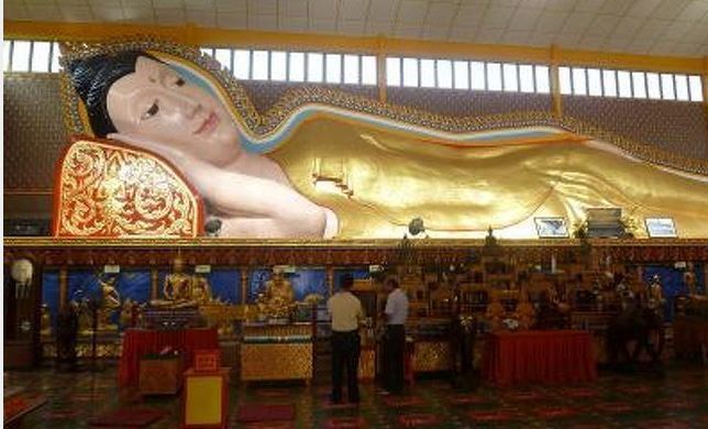 次に寝釈迦仏寺院全長33mと世界で3番目に大きな寝釈迦仏が、横たわる寝釈迦仏寺院は、タイと中国式が融合したユニークな造りで金箔をまとった寝釈迦仏は本堂内にあり迫力ある姿には驚かされた。
