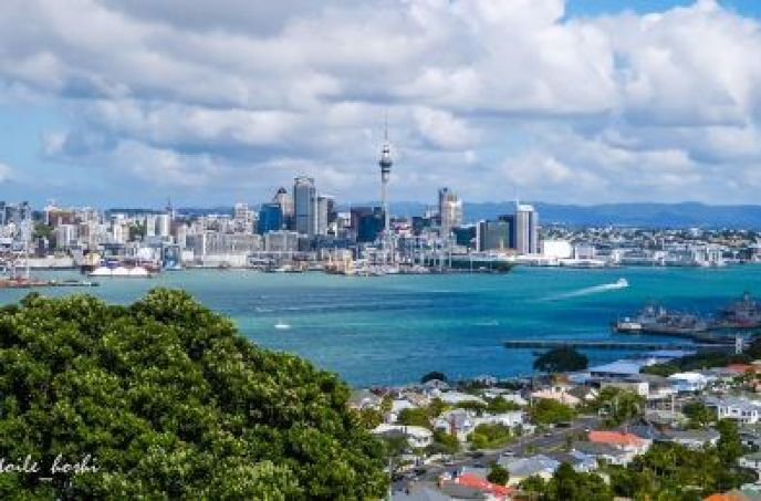向こうにはヨットやフェリーが行き交うエメラルドグリーンがまぶしいワイテマタ湾がある。スカイタワーを中心としたオークランド・シティのコンパクトな街並みが広い空の中に浮かんでいます。全方向の景色を振り返れば円錐形の美しいランギトト島もすぐ目の前。
