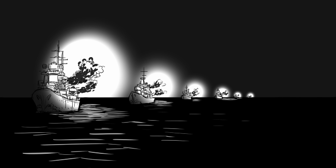 暗闇に多数の閃光が輝き砲撃の煙が閃光に照らされてスケール感を大きくする。