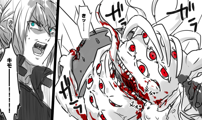 赤子の腹を思わせる胴体から、にゅるりと血管のようなピンク色の枝分かれした紐が飛び出ている。その紐は血で濡れており、まだ鮮やかにきらきらと照明を反射していた。幾つもの眼球が、周囲をぎょろぎょろと見渡す。