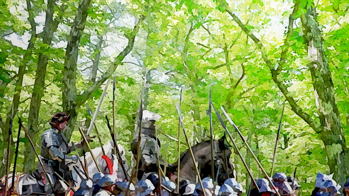 大盾と槍を持ち、隊列した兵士たちが、前進し、敵を後方へ押しのける戦術。