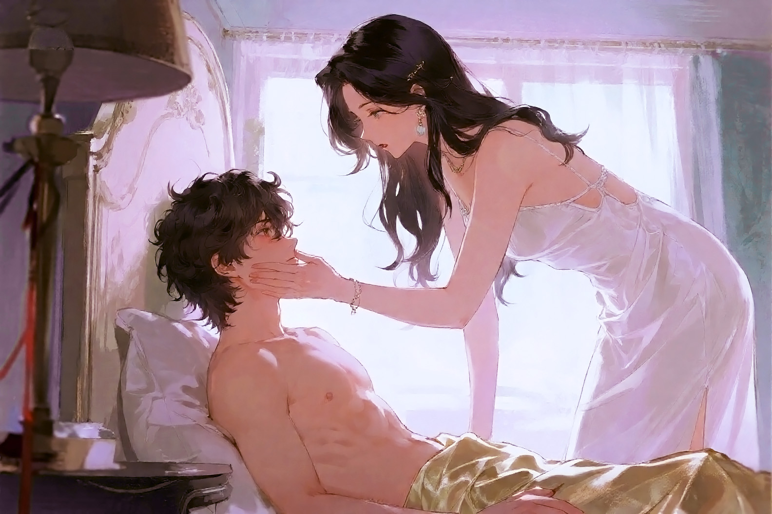 彼女はリー・チョンシーの体を乗り越えて手を伸ばし、彼の携帯のアラームを止め、シーツを巻きつけてベッドから滑り降りた。その時、二人が大きな一枚のシーツを共有していたことに気づいた。彼女が巻き取ってしまったため、リー・チョンシーは完全に空気にさらされてしまった。