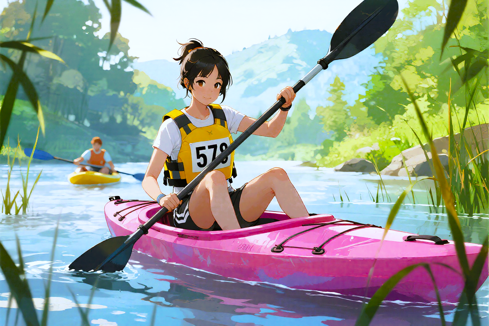 スー・シエンは彼の肩につかまってカヌーに乗り込み、前後を見回して、前方の黄色のカヌーを指さして言った。「あの人が私を突き刺したの!」