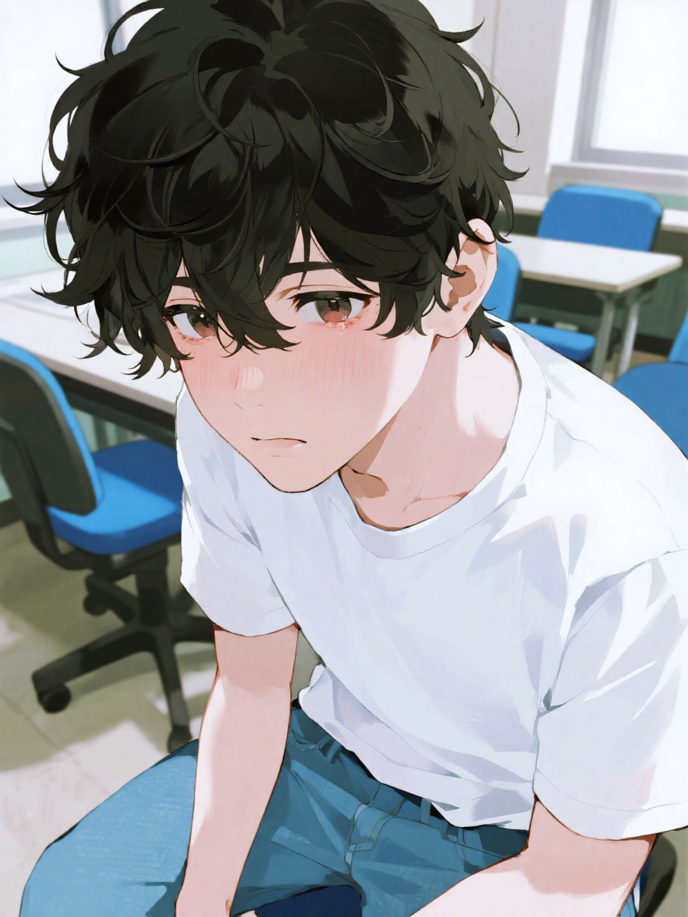 彼は顔を上げ、潤んだ瞳を向け、表情は少し悲しげだった。