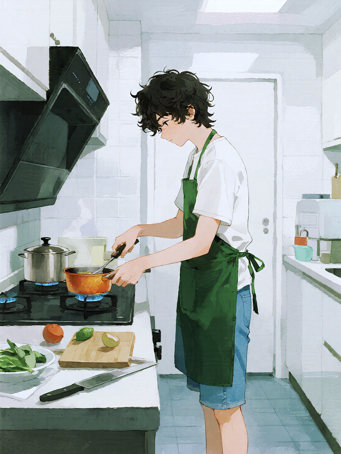 リー・チョンシーは、前回北海道に持参したエプロンをつけ、狭い台所の前でご飯をよそっているところだった。