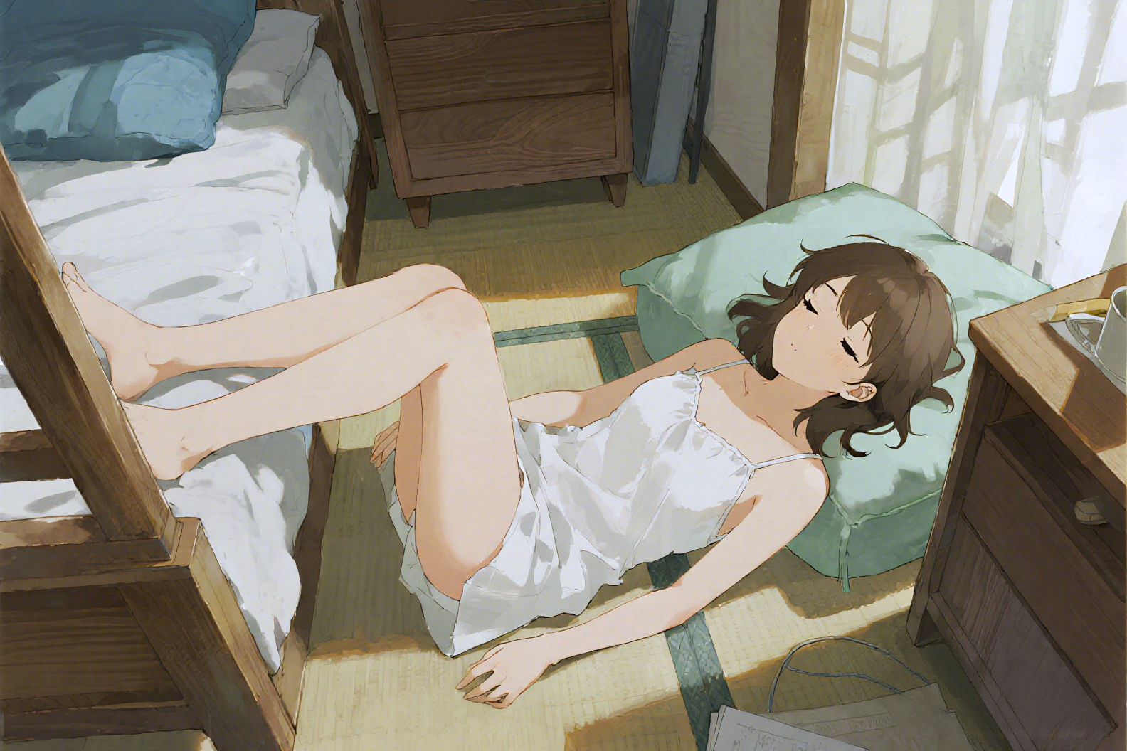 スー・シエンは本田の名前を呼んで何度かドアを叩いたが、返事がない。慎重にドアを開けると、彼女は毛布にくるまったまま、上半身が床に落ち、脚がベッドにかかった状態で、まるで気絶したように眠っていた。スー・シエンは彼女を優しく叩いて起こし、顔を洗って食事の準備をするよう伝えた。