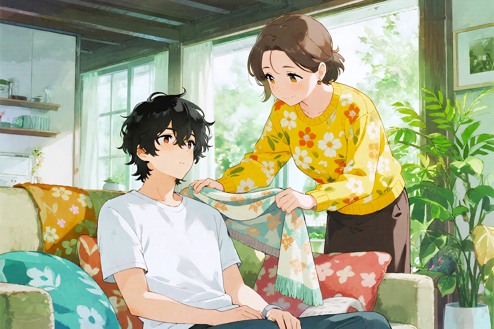 李瀟(リー・シャオ)が上着を羽織って寝室から出てきた。彼が半袖なのを見て、部屋から小さな毛布を持ってきて彼を包んだ。「こっちは東京より寒いんだから。暖かくしてなさい、また下痢するわよ。」