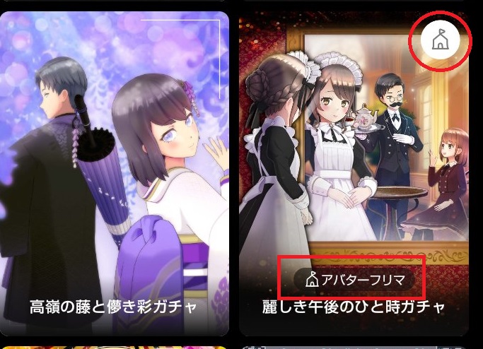 アバターフリマはメインページのガチャのボタンを押すと、アバターフリマに行けます。