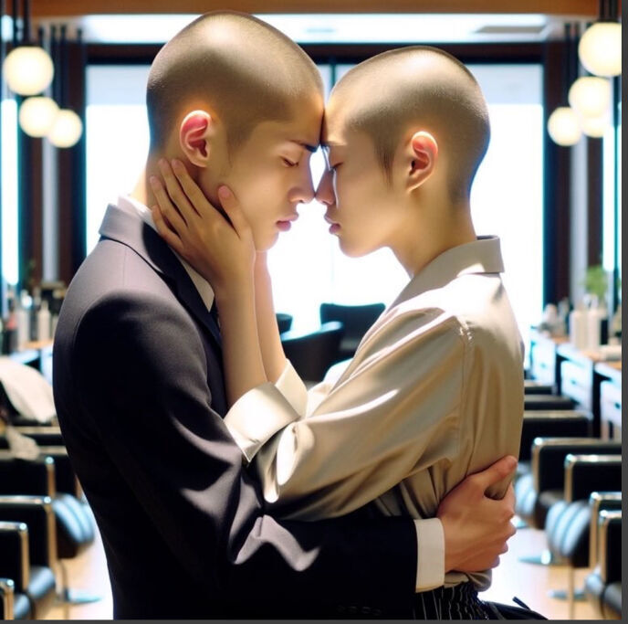 二人の間には、共に未来を歩むという確固たる決意がありました。二人の坊主頭は、新しいスタートを象徴しており、二人の深い絆は、彼らが共に未来を切り開く力となっていました。二人は過去の重みを背負いつつも、共に進む新しい未来への確かな約束を交わしました。