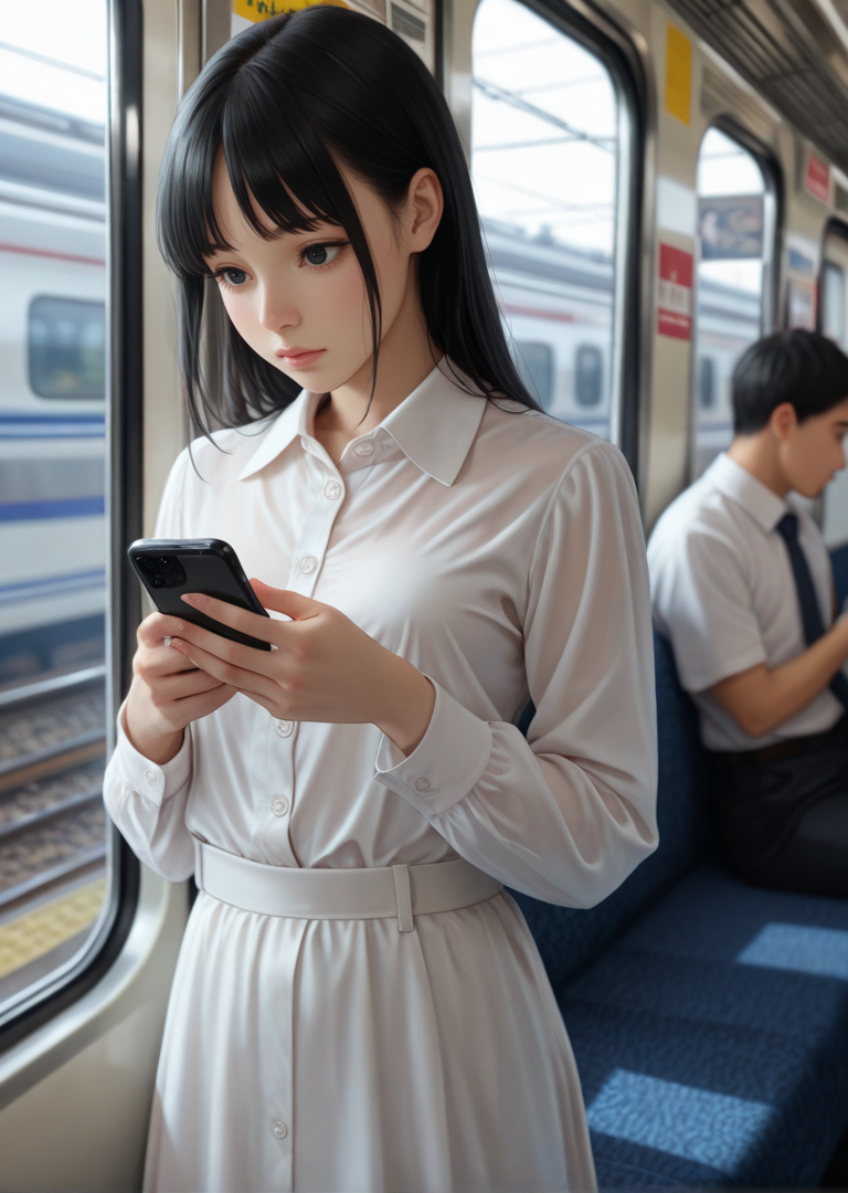 向かいに立つ女性の姿が、裕介の視線を捉えた。若い女子大生だろうか。清楚な白いブラウスに膝丈のスカート、色白の肌が朝の光に透けるように輝いている。黒髪をポニーテールにまとめ、スマホに夢中で周囲の様子など気にも留めていない。従順そうな雰囲気、裕介の好みドンピシャだ。電車の揺れに合わせて体が少し揺れ、胸元がわずかに開く。「くそ、可愛いな……触りてえ」裕介の性的妄想が疼き始める。童貞の彼にとって、こんな美女は画面越しの存在でしかなかった。