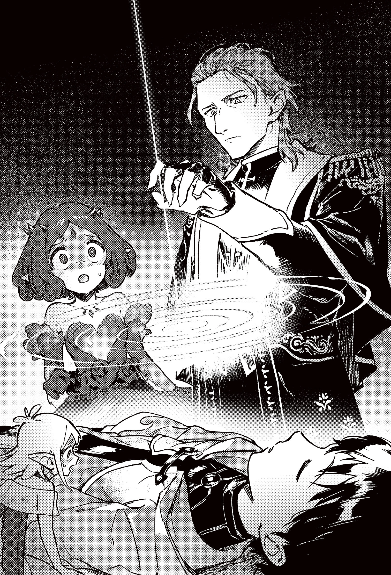 イポスが寝ているルフトに手を翳したまま一言二言聞いたことのない言葉を呟いた。するとルフトの上に水面のような光の波紋が現れた。