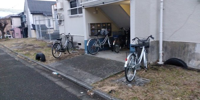 詞書:私の住むボロ団地の光景。ポスト前にわざと自転車を置くヤー公ストーカーどもの嫌がらせ(自転車の専門置場が別にあるのに…)。管理人は一切無視。なぜならツルんでいるからだし、第一、こいつらストーカーどもに部屋を又貸ししている張本人なのです。