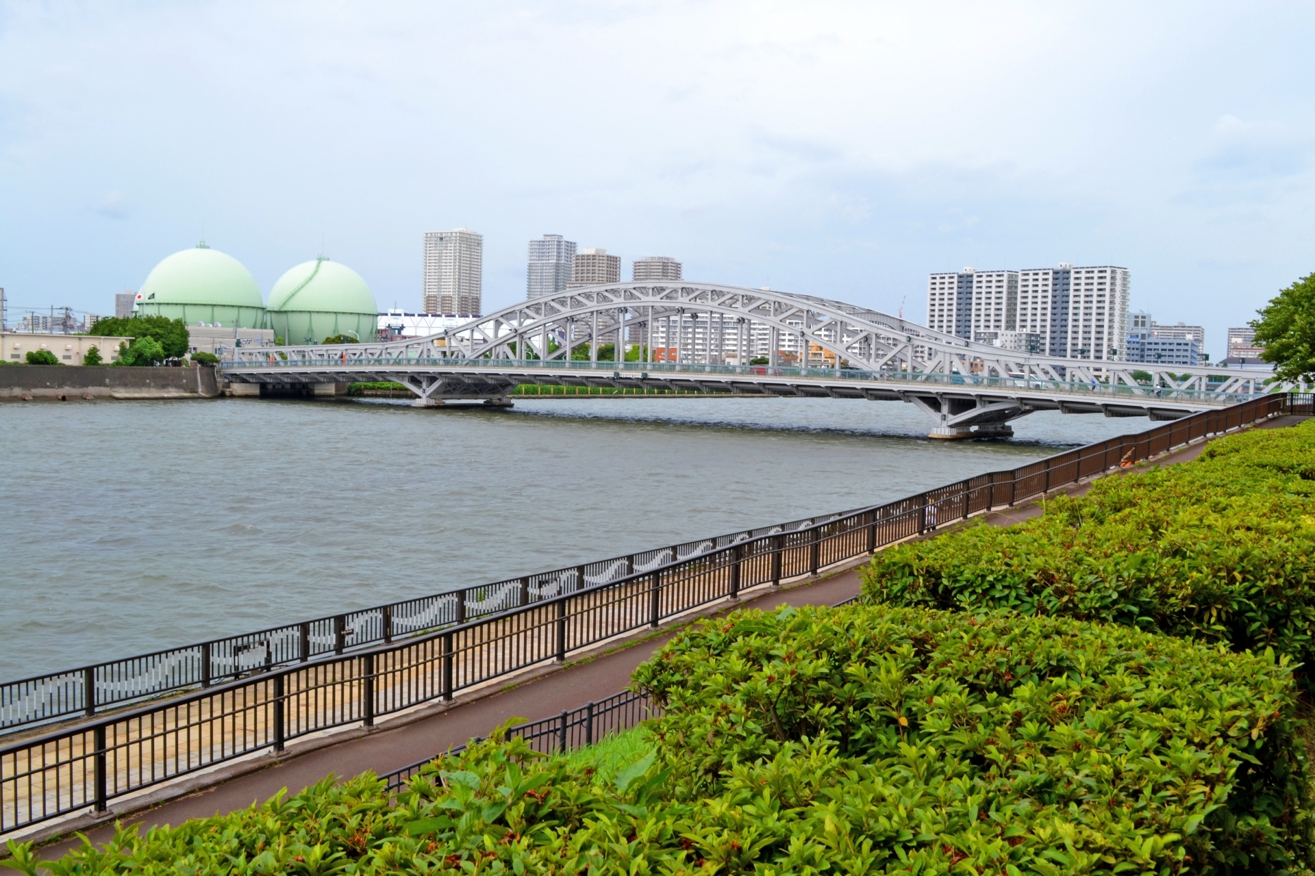 【昼間の白髭橋の写真。私のアパートは橋向に見える東京ガスのタンクの近くだ】