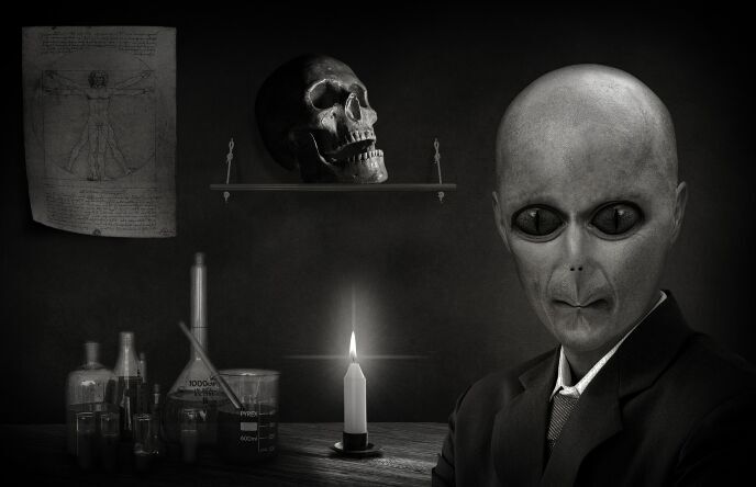脚注;学問に衝かれるあまり倫理を忘れ善悪を忘れて己が研究に猛進してしまう科学者がいます。本稿のマッドサイエンティストも本来は心理学博士であり同時に精神科の医者でもあったのですが、人間の深層心理を追求する過程でその禁忌を犯してしまったのです。もともと現代科学は物質的側面からの追求ばかりで異次元存在と思われる心への探求が決定的に欠けていると、そのようにも常々確信している人物でした。普段の診療に於て多重人格症の患者などをヒプノセラピー催眠療法へと誘うと、時に説明不能の変貌を起こすことに驚嘆し、それに着目して、症状を綿密に分析し行く内に遂にこれこそが異次元存在の現証であると、そう結論付けるに至ります。こうして異次元を確信した彼はやがてこの催眠療法を逆に己に施して、マッドサイエンスへの入口としたのでした。化学者でもあった彼は映画「アルタード・ステーツ/未知への挑戦」の如くに、自分が調合したLSD的な幻覚剤を使って異次元の世界を自由に探訪するようになりました。しかしこの研究の成果を今度は実証せねばなりません。どうするか?彼には自明でした。すなわち異次元の存在を逆にこの世、現世に顕現させればいい分けです。やがて彼はこれにも成功するのですがしかし実はそこに於ては異次元における彼への協力者、と云うか指南役が居たのです。その協力者とは果して…。彼への現世におけるパトロンも含めて、あとは小説へとお進みください。