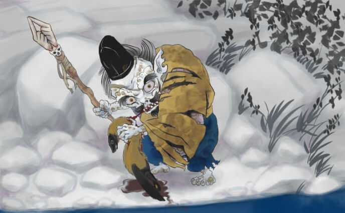 小さな影は時折何かをつぶやいて立ち止まる。しわくちゃの青白い顔に、平安時代の装束に似たボロボロの狩衣を着た小さな幽鬼。額に生えていたであろう2本の角は根元から折れて、顔に無残な傷跡があった。