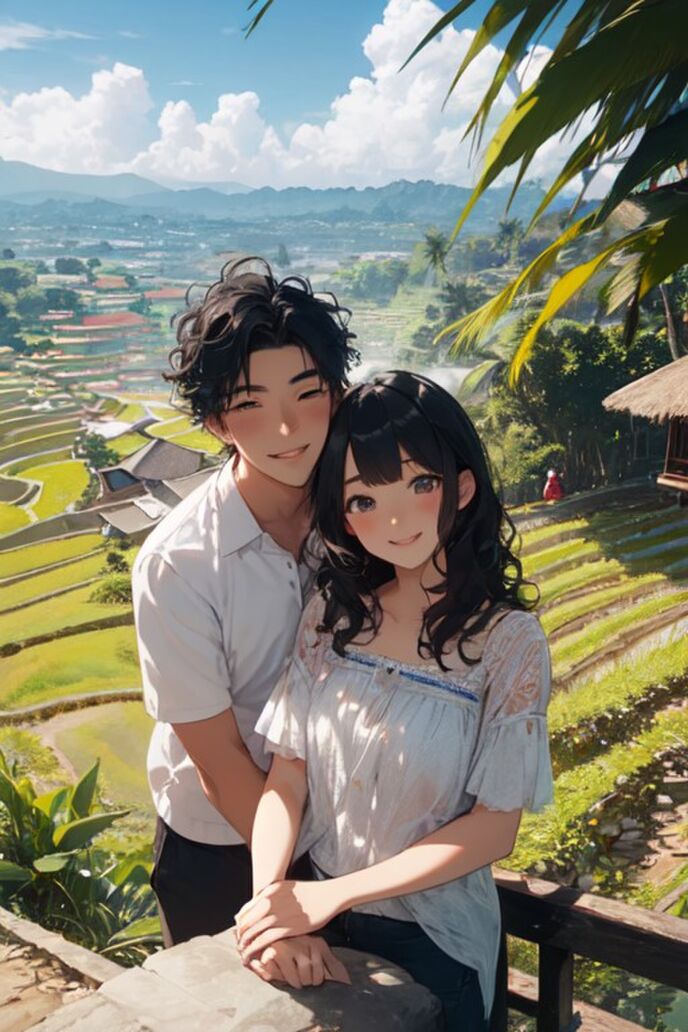 初めての海外旅行で緊張する靖を晶がリードして、テガラランの棚田を望む絶景レストランで現地料理に舌鼓を打ち、お決まりの映えスポットのバリ・スイングでは大自然の中の巨大ブランコを楽しんだ。バリのパワースポットのテグヌガンの滝で自然と湧き出る聖水を手にして口に注いだ。