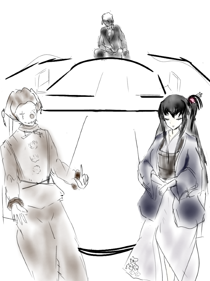 ピエロのアルバと和服の女性は顔を合わせるなり、互いに険悪なムードを漂わせていた。