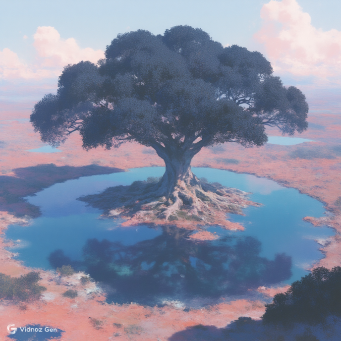俺がサファイヤを落とさないように慎重に運んで、サファイヤの指示に従って歩いていくと、遥か遠くに一本の大木が寂しげに葉を揺らしているのが見えた。その根元には、透明な水の張った池が、コンパスで描いたような綺麗な円を描いていた。