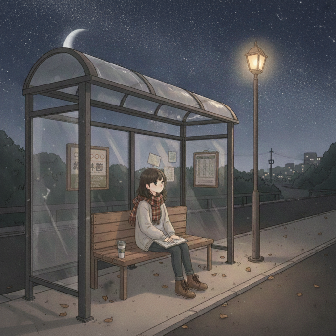 夜風が、バス停のそばにある街路樹の葉を揺らし、アスファルトに落ちる影がさざ波のように動く。