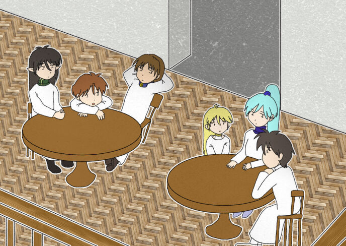 三人がフィルたちを眺めていると、気付いたティアスが手招きする。呼ばれたのなら仕方ない、と三人はフィルたちの元に向かった。フィルとティアスとミーンの三人のテーブルの隣のテーブルの椅子にヴィッツたちは座る。