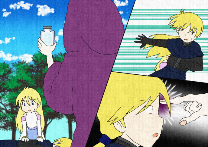 とティアスは少年に言う。少年は頷きティアスの後ろに隠れた。グレイの前にはフードを深く被っている、紫色のボロボロのローブを着た男が立っている。