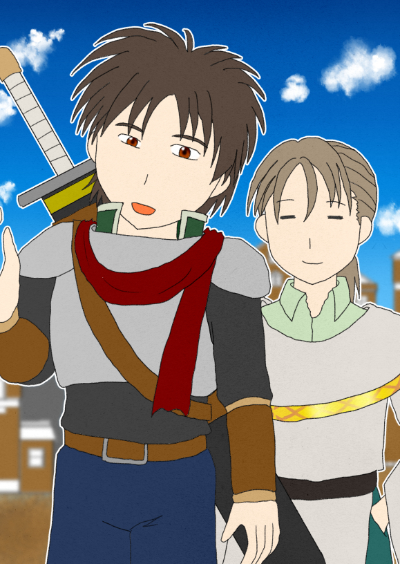 と言った。声の方には二人の男性がいた。一人はボサボサな髪の大剣を背負った戦士。もう一人は目を閉じた状態でやってきたサラサラな髪を束ねた術士のような姿。そんな二人がファラたちの元に到着する。大剣を背負った男性が