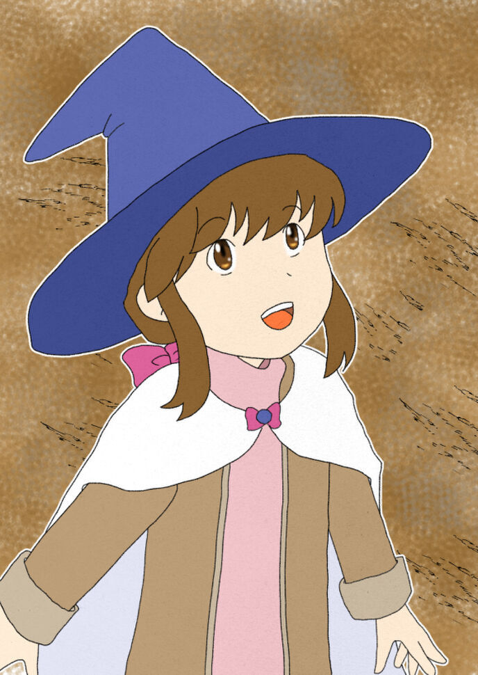 一夜明けて外を見ると、ごく普通の町のようで賑わいを見せている。食料などの補充もかねて数日はここで過ごすことに決め、一行は町の中を歩く。大きな広場に出ると、子供が三人いた。その一人がこちらに気付き走ってくる。見たところ十代前半で、長い三つ編みに少しウェーブのかかった髪の、とんがり帽子のいかにも魔法使いといった姿の少女だった。少女は一行の前に来ると