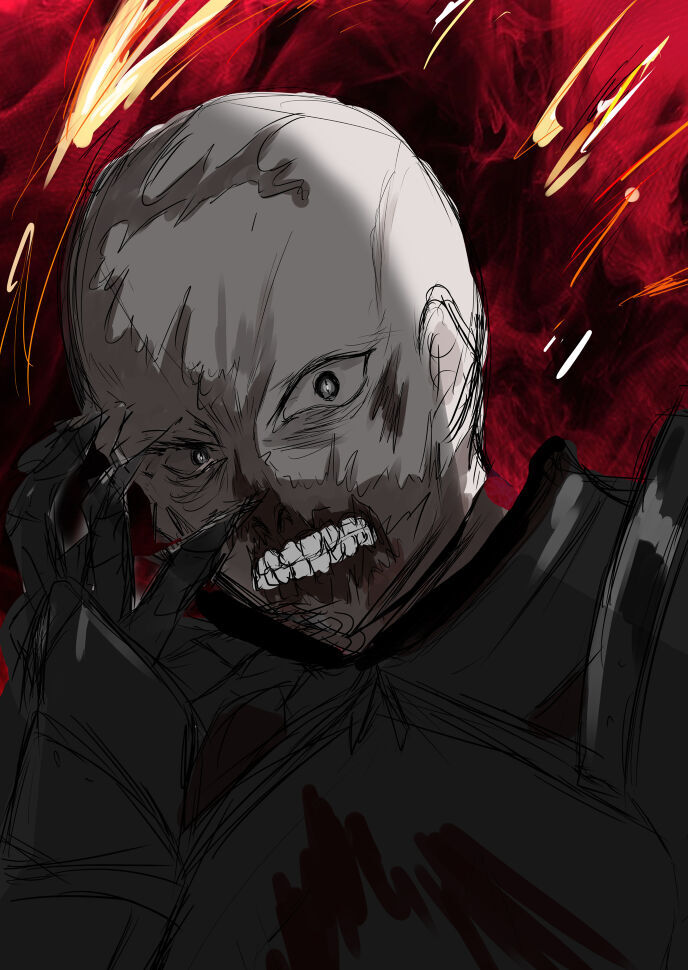 皮膚は爛れ、顔のほとんどが火傷の跡で覆われている。