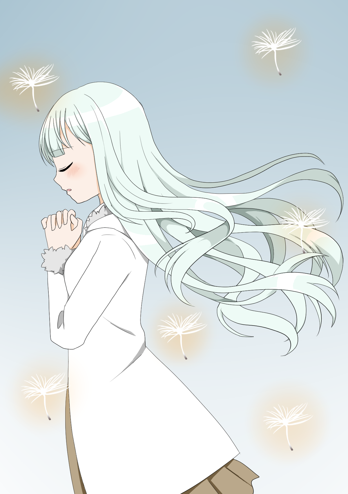 ひとしきり興奮した後、彼女らは待ち合わせの噴水公園へと足早に向かった。何かとよく来るその自然公園は、ワープフープから歩いて三十分程度の場所に位置している。木々は常緑樹らしく、今も葉が落ちずに生い茂っているが、緑豊かないつもの様子とは全く違った景色が広がっていた。綿帽子をかぶった木立に、積雪に埋もれた芝。見渡す限りの銀世界だ。そんな風景の中に溶け込むように、白い少女が立っているのを発見した。