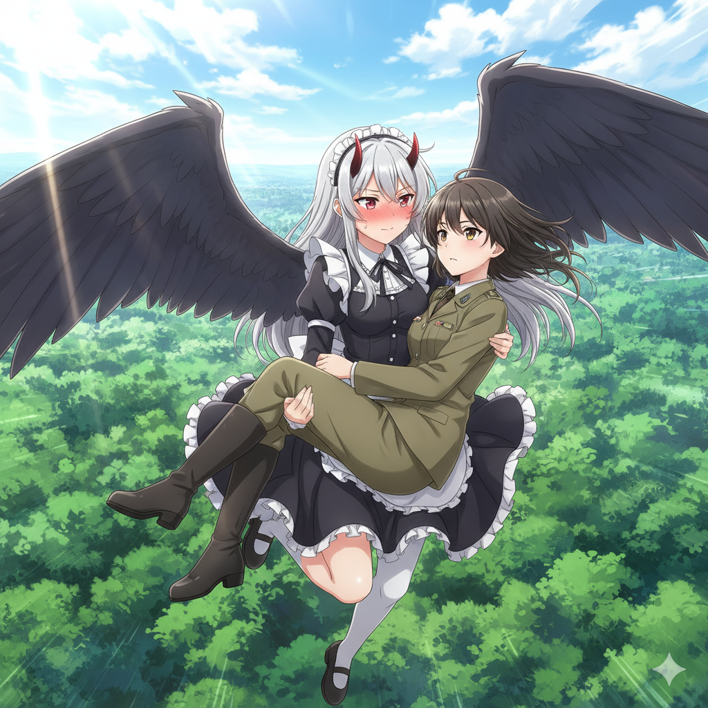 そして彼女が背中から漆黒の羽を伸ばして、羽ばたくと、僕とアルファの身体はたちまち宙に上がった。