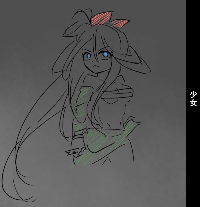 黒髪ロングヘアを赤い布で縛った女性。