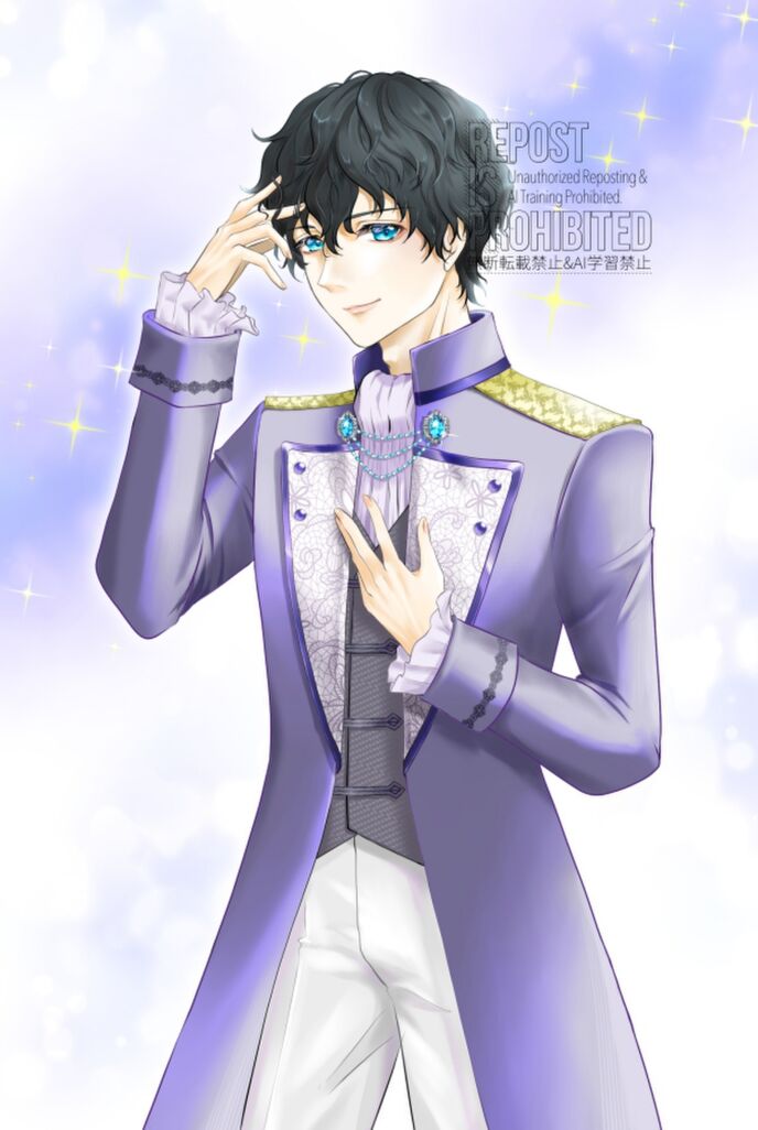 彼の着ている薄い紫の服はなめらかで艶やかで、いかにも高級そうな布を使っている。胸元の大きな宝石は色鮮やかな青で、肩の金の飾りだってとても豪華。すっごくキラキラしい人物だ。