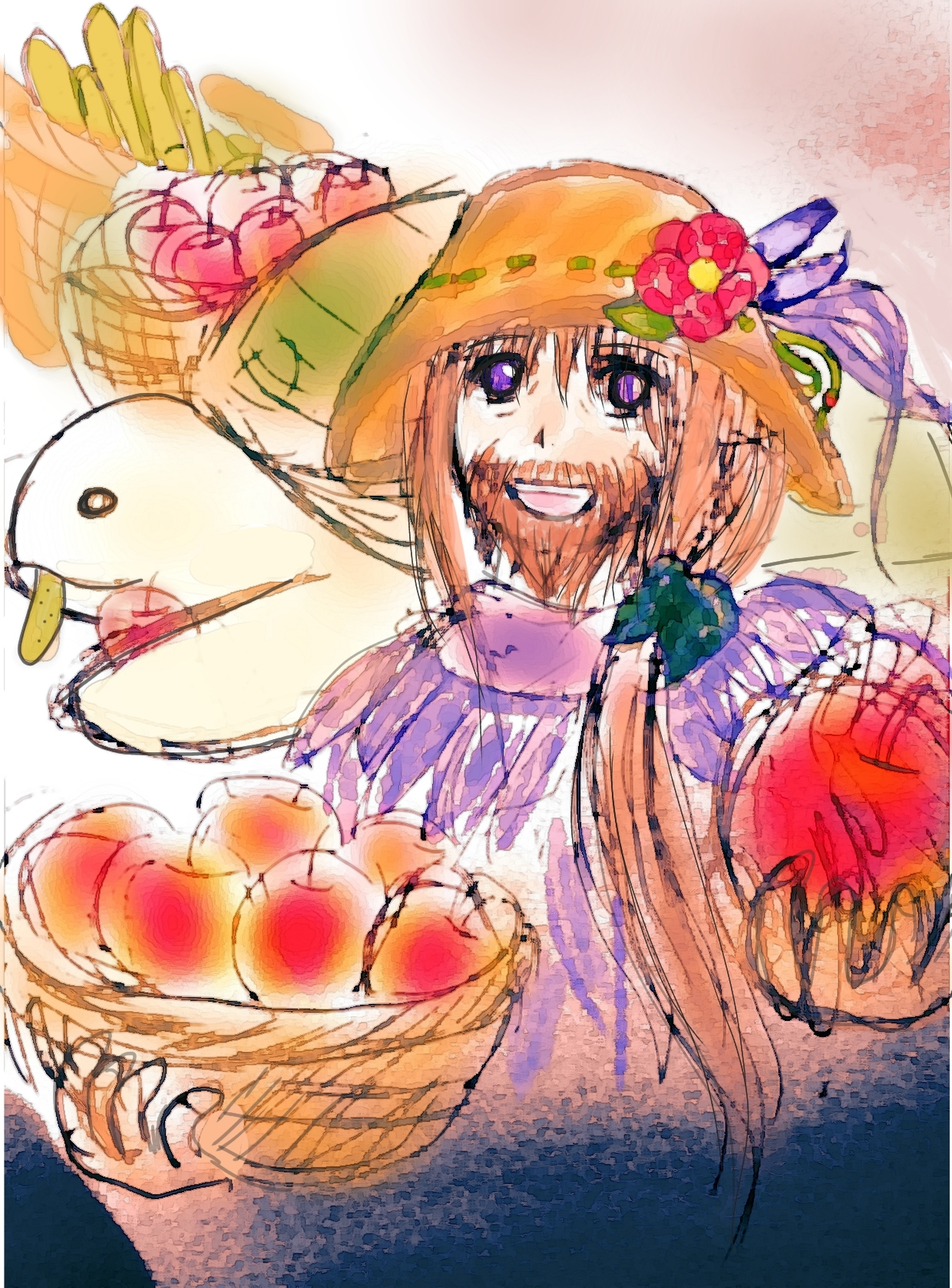 帽子の男の後ろには、巨大なカメがいて大量のキュウリとリンゴが入ったカゴを背負っていた。