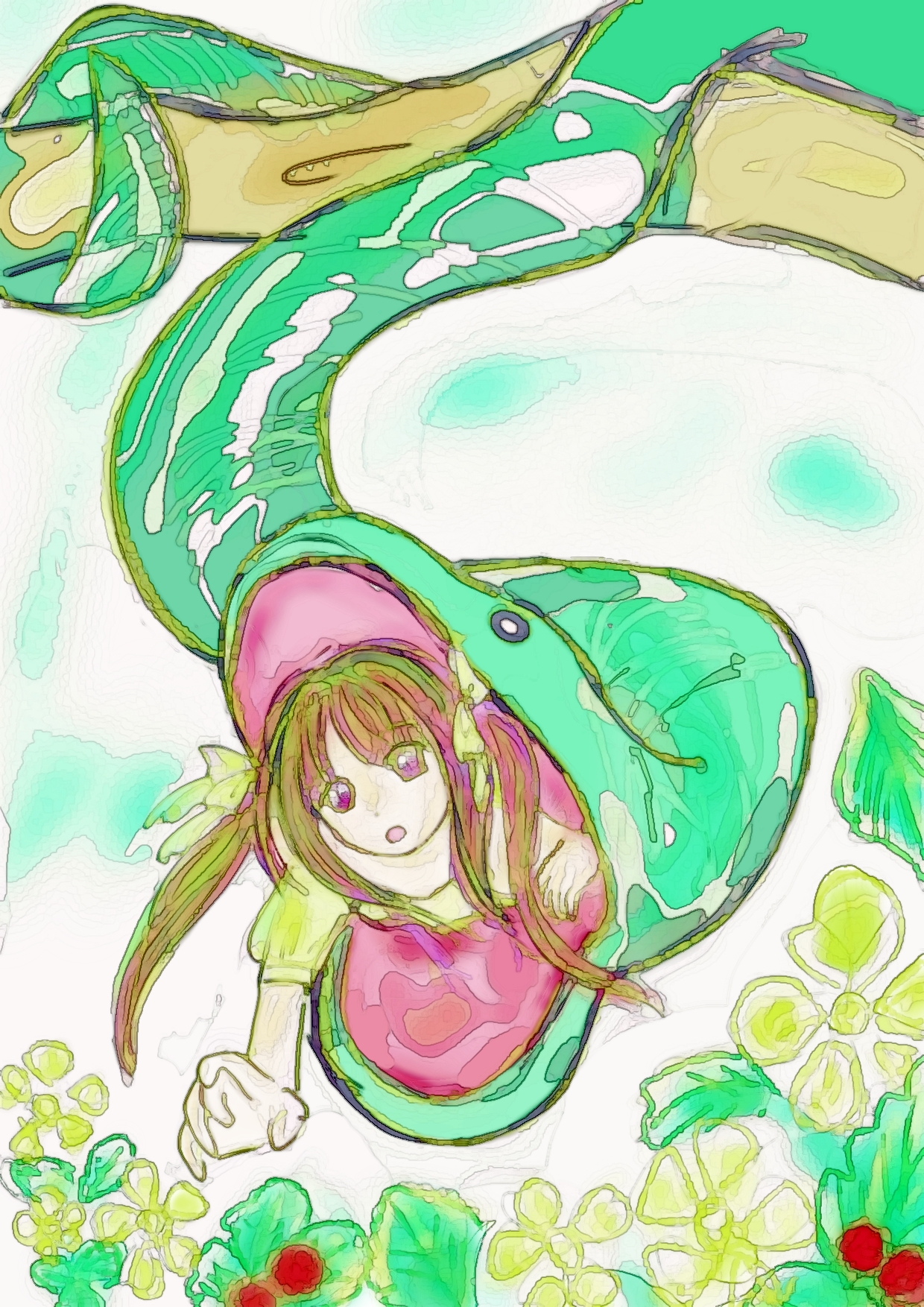 「木にぶら下がってるヘビさんの口の中に女の子がいて手をバタバタと動かしているね」