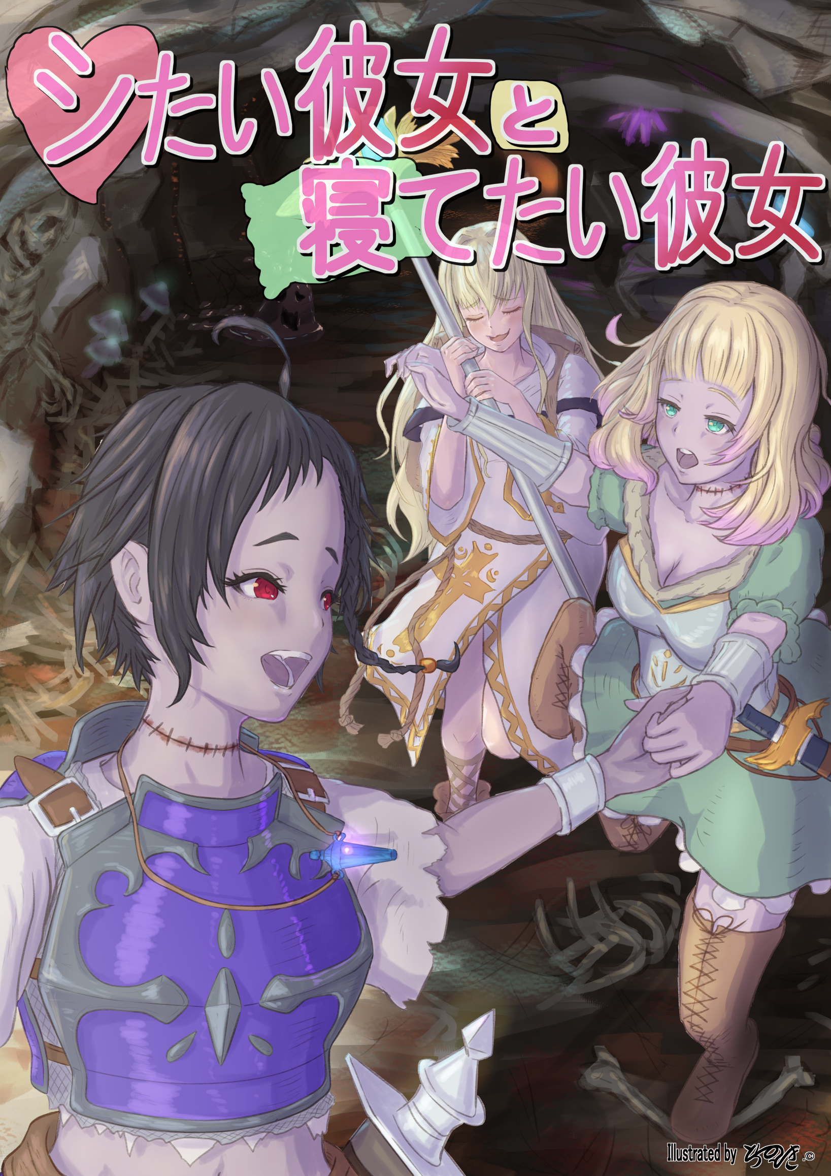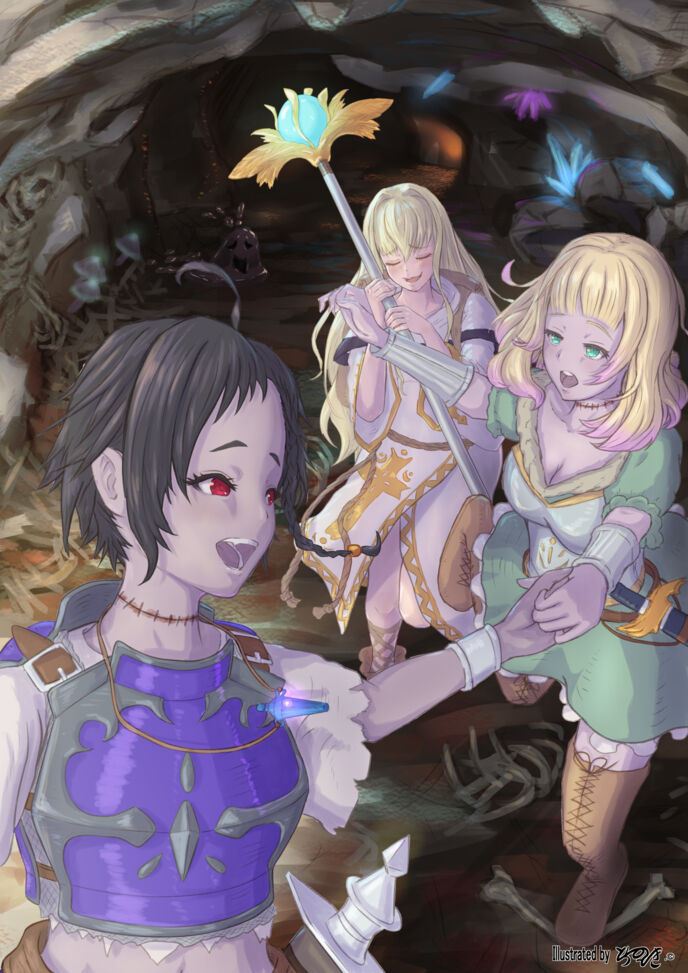 深い深い闇を湛える、広大な埋葬区域の一角。蝋燭と松明の明かりに照らし出された裸の少女は、魔術師が使う杖を、石造りの床に打ち付け、二体のアンデッドに向かって叫ぶ。