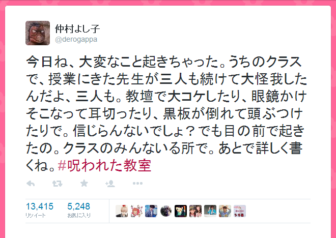 それは「#呪われた教室」というハッシュタグまで作っての連続ツイートで、朝から続く不幸の頻発を実情より大げさな怪現象として、おもしろおそろしく実況する内容だ。初めのうち真に受ける者は少ない様子で、リプライを見ると、「黙れ、童貞」「昼間っから悪夢うなされてんじゃねぇよ、ボケ」「てめえの顔のほうが怪異だわい」など盛大な出迎えぶりだった(そら、馬鹿にされるわな)。