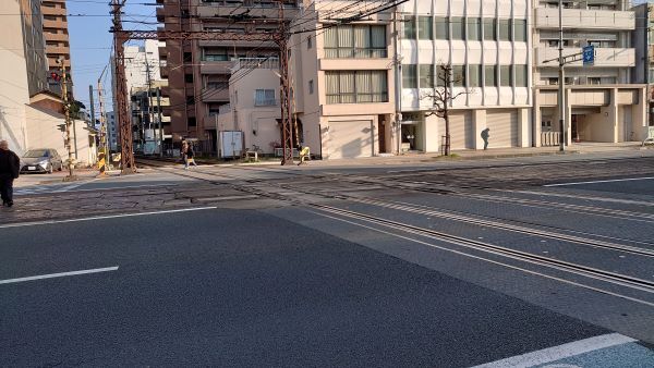 全国で唯一、鉄道線と路面電車の軌道線が垂直交差しているスポットだ