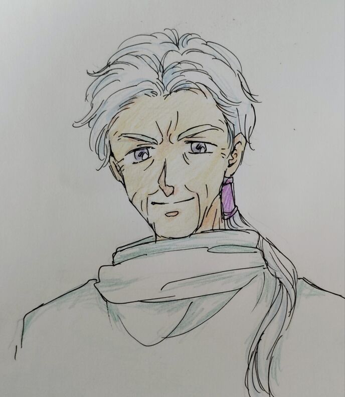 頑固で偏屈なお爺さん。白髪混じりで色褪せた水色の髪を後ろで一つ縛り。藍色がかった水色の瞳のシワのある顔。ちょっと厳つい。老人だががっちり体格はいい。