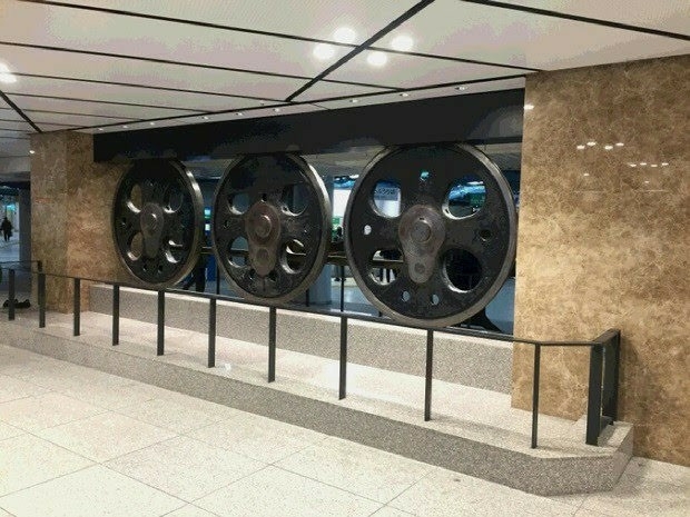 地上の丸の内南口改札のドームを通って地下へとやって来たのだが、なかなかの広さだった。この動輪の広場にある立派な動輪は、実際の列車の車輪で、かつて東海道線を走っていたC62-15型蒸気機関車のもので直径1m75cmの動輪が三つ並んでいる。通称シロクニと呼ばれて親しまれていた列車で、これだけでも博物館に置けるほどの価値ある代物だろう。