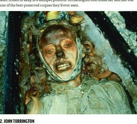 「フランクリン遠征は、1845年に英国を出発したイギリスの北極海探検航海のことですわ。22歳のジョン・トリントンという方が乗組員としてこの遠征に参加中、鉛中毒により死亡し、凍土に埋葬されたのです。ところが1984年に科学者が調査の為、トリントンの墓を掘り起こしたところ、遺体は完全に冷凍保存されていたのです。しかし、その姿が衝撃的だったのですわ。それが、その写真。トリントンの眼を見開き笑っている様なこの遺体の写真は、世界中の人々にショックを与えたのですわ。先ほどの貴方達のように」