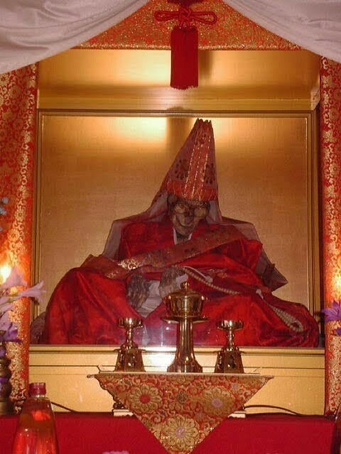 今度はミイラのようである。ミイラが立派な台座のようなものに安置されている。ミイラは高帽子を被り、高僧の着る立派な袈裟をその身に纏い、座禅を組んでやや前傾している。僧侶の前には鈴に燭台といった仏具が置かれている。