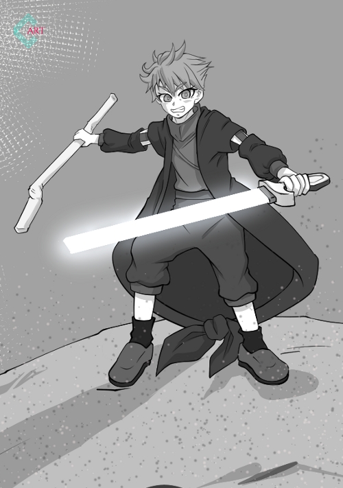男子が握る金属の棒とは別に、腰から小さなグリップを取り出すと、電源を入れて、鮮やかな青緑色に光るレーザーの剣をつくりあげた。それは、雷刀、と言われる人界族を統治する銀河連邦の軍人を含む行政の戦闘員などが装備している兵器で、金属や生物を切断できる立派な武器なのだ。殺傷能力が高い危険なものであり、連邦に所属しているような雰囲気でもない男子が、緊張した表情で雷刀の先を周囲に向けていた。