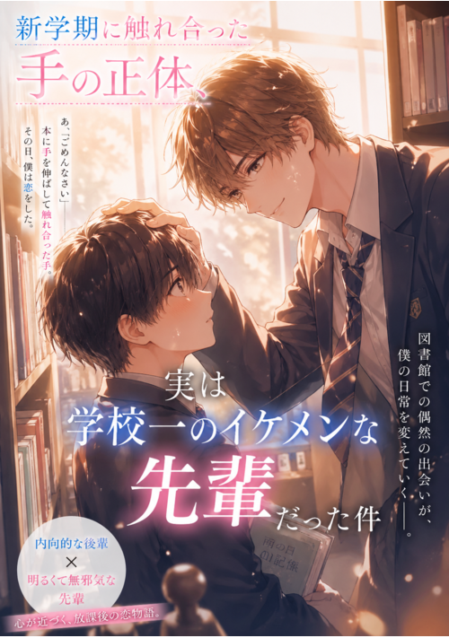 新学期の放課後、図書館で一人静かに過ごす内向的な僕は、本を取ろうとした瞬間に誰かと手が触れ合う。その相手は、図書館には似つかわしくない明るくて整った容姿の“学校一のイケメン”な先輩だった。