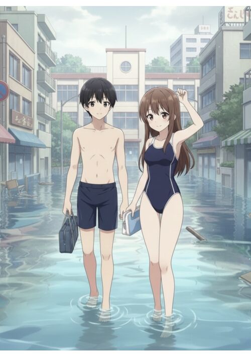 高校生の東浦は、ある朝目覚めると、世界が一変していた。街は水没し、道路は深い水路に変わり、人々は皆水着姿で舟を漕いで生活している。女子高生たちのビキニや競泳水着が日常の風景となるこの奇妙な世界に戸惑いつつも、心のどこかで喜びを感じてしまう東浦。それは、彼がかつて冗談で呟いた「女子の水着を日常的に眺められる世界がいいな」という願いが、意外な形で叶えられた結果だった。